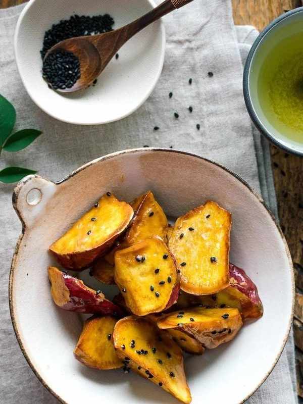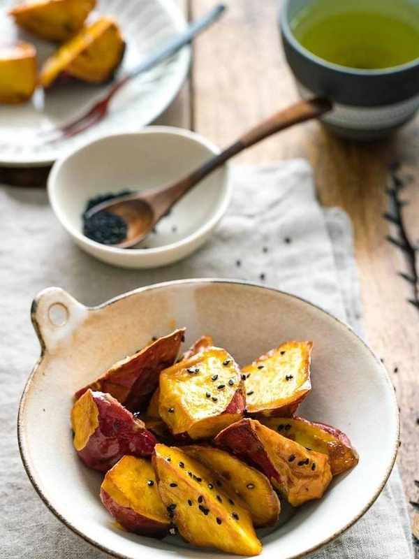 9.取決於地瓜的大小,烹飪時間會有所不同,烹飪8-10分鐘或直到竹簽順利通過為止,裝盤,撒上黑芝麻。