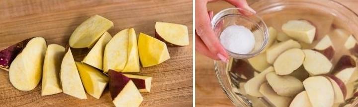 2.將地瓜放入水中,加2勺鹽,浸泡15分鐘以去除淀粉。