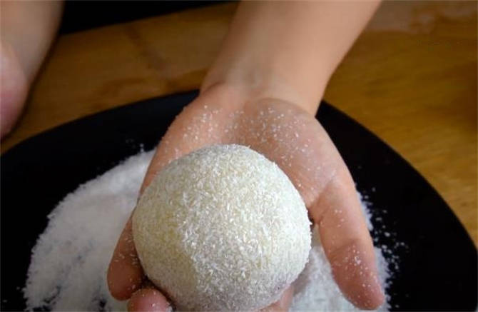 9.這個是剛才準備好的椰蓉,最後裹一圈,這個草莓大福就做好瞭。