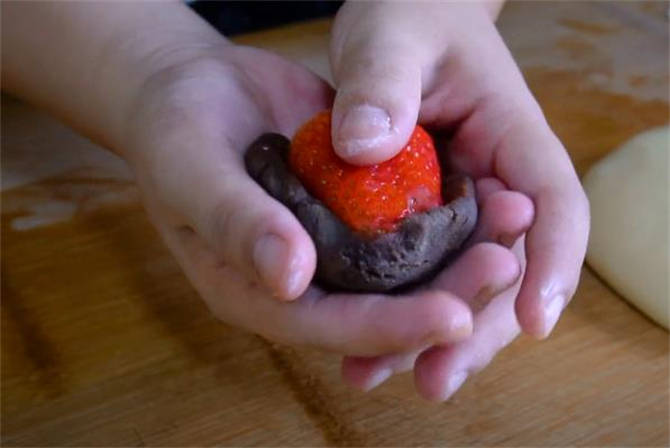 7.準備點豆沙餡按扁,把這個草莓包進去。