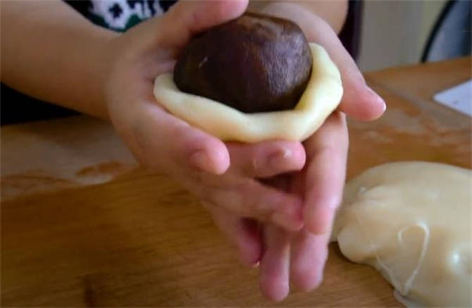 8.再揪一點這個團好的糯米面團, 同樣的也按扁,再把這個豆沙草莓包進去,收口給它封緊。