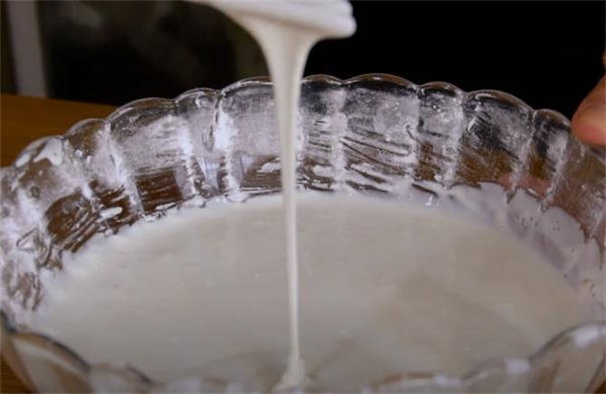 2.準備240g的糯米粉,60g玉米淀粉,60g白糖,再倒上340g的牛奶,把它攪勻瞭,一直給它攪到沒有疙瘩就可以瞭,提起來呈流水線的狀態,這樣最好瞭。