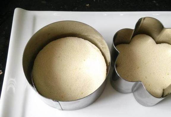 1.用慕斯圈切割出一塊蛋糕,墊在底部。(如果沒有烤箱,也可以用餅幹碎加點黃油,壓實。)