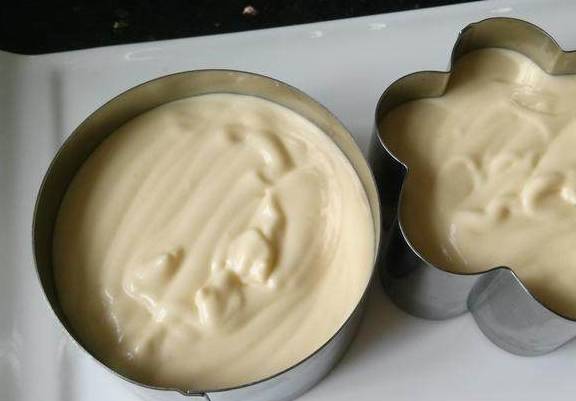 8.把芒果慕斯液倒入剛才放好蛋糕底的慕斯圈裡,放冰箱至少冷藏4小時以上,我放瞭一晚上。如果時間緊,也可以冷凍一下,會更快。