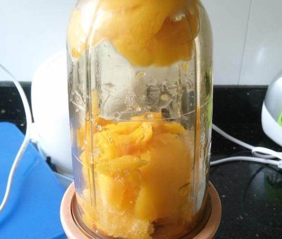 3.芒果去皮,切小塊,加入細砂糖,用料理機打成芒果泥。