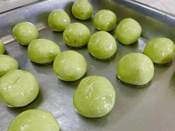 將青團包好隻是第一步,蒸的細節和火候才是關鍵。隻見糕點老師在包好的青團外皮上裹上油,並設置瞭十五分鐘的鬧鐘。“刷上油的青團蒸出來不僅油亮亮好看,還可以防止青團粘連在一起。”糕點老師解釋道。
