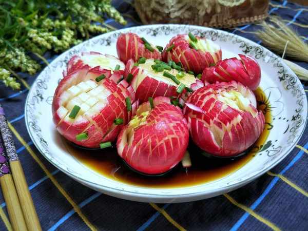 食材:櫻桃蘿卜一盤、鹽、糖、生抽、醋、香油適量。