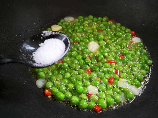 2、起鍋燒油,將準備好的小米椒段蒜片放在鍋中,炒香,加入青豆翻炒變深綠色,加少許鹽,1勺生抽調味,最後加半碗水燜煮至收汁。