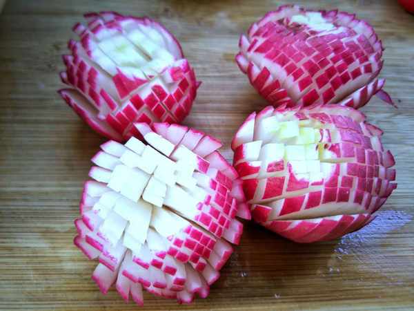 2、橫向連刀薄片,底部不要切斷,或者用兩筷子夾住切橫向薄片,這樣不容易切斷,再把豎刀著切,切好瞭以後把花瓣稍微往開撥一撥。