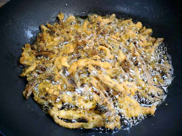 3、鍋裡放油,五六成熱的時候,把香椿夾進去,中小火炸至香椿芽表面金黃出鍋,全部炸完後再入油鍋復炸一次,更酥脆,吃一口酥脆可口,比肉還好吃,這才是春天的味道。