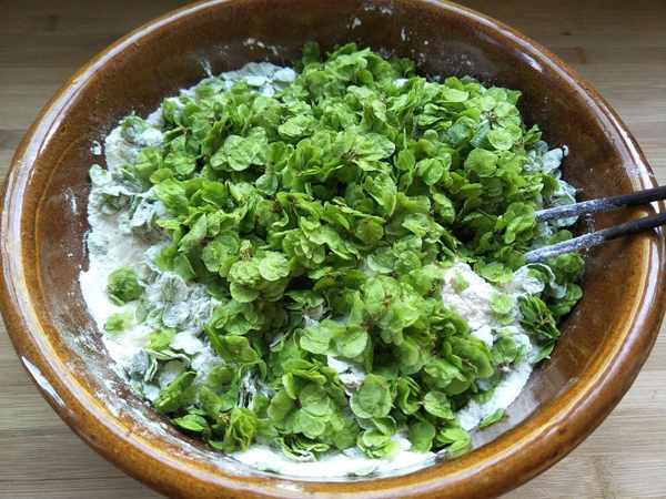 做法:1、榆錢泡在水裡,多洗幾遍,撈出擠去水份,面粉入盆,加5克酵母攪拌均勻,榆錢加入面粉中加少量鹽,喜歡吃甜的可以加白糖。