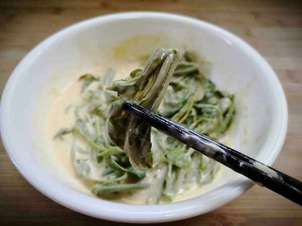 2、面粉裡打入一個雞蛋,加入少許鹽,胡椒粉,再加入適量清水攪拌成無顆粒粘稠的面糊即可,稠度不要太稀,太稀就掛不上漿,把焯燙好的香椿分批放入面糊中。