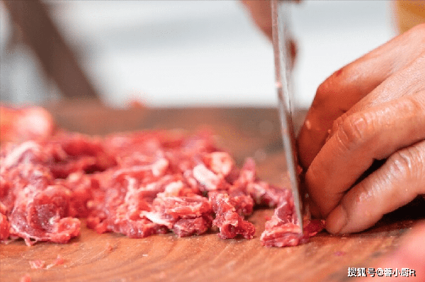1、牛肉清洗幹凈後,逆著牛肉的紋理切片後裝入碗中。