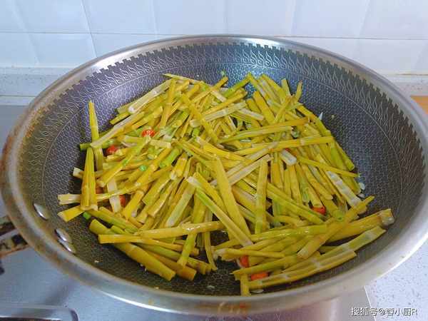 6、起鍋熱油,下蔥蒜小米椒爆香,接著把竹筍倒進來炒。大火翻炒一分鐘後把韭菜也倒進來,調味加鹽、雞精、糖、生抽、蠔油,拌勻後就可以關火瞭。