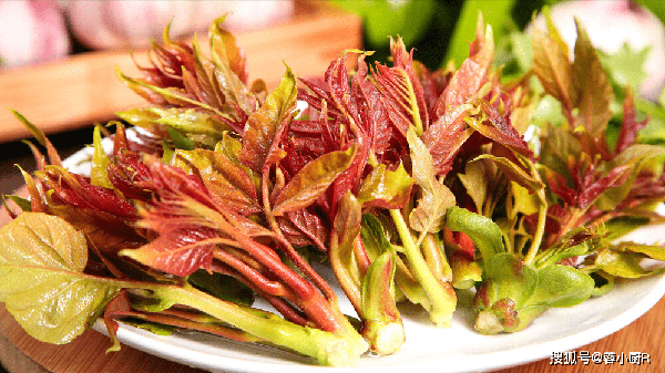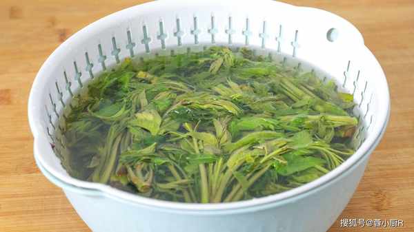 2、香椿燙軟後立馬撈出來,過一下涼水降溫,顏色會更漂亮。