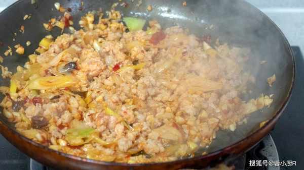 4、熱鍋倒油,豆瓣醬來一勺,先炒香,蔥薑蒜加進來,炒香後把肉沫加進去炒一炒,炒過的肉沫會更香一些,喜歡吃辣的還可以放點辣椒面;