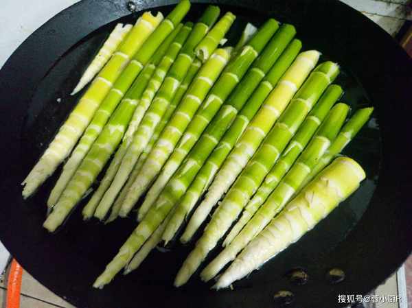 1、新鮮的春筍一斤,剝皮後削去老的根部,這種春筍是我們當地的小竹筍。起鍋燒水,水開加一勺鹽,下入竹筍焯水,大火煮6-8分鐘,將竹筍煮一下,不僅可以去掉它的澀味,還更方便我們保存。