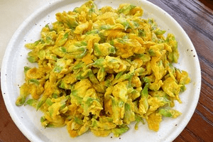 7、韭菜燙一下就能熟,所以最好放,而且炒的時間也要盡可能的短,最好是不超過1分鐘。出鍋後裝盤就可以開吃的。