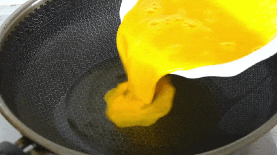 5、起鍋倒油,油熱淋入蛋液,用鍋鏟推動的方式煎雞蛋,蛋液完全凝固後鏟成小塊兒,然後就可以關火出出鍋瞭。