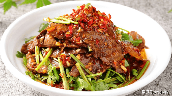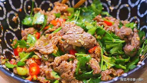 6、接著把滑好的牛肉倒入調好的料汁裡,把香菜也放進來,拌勻就可以開吃瞭。