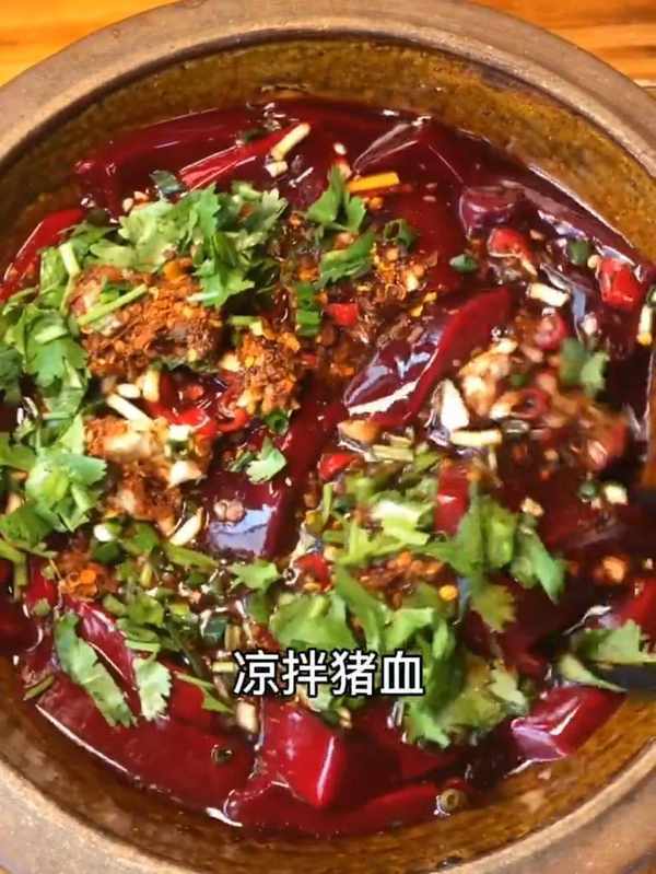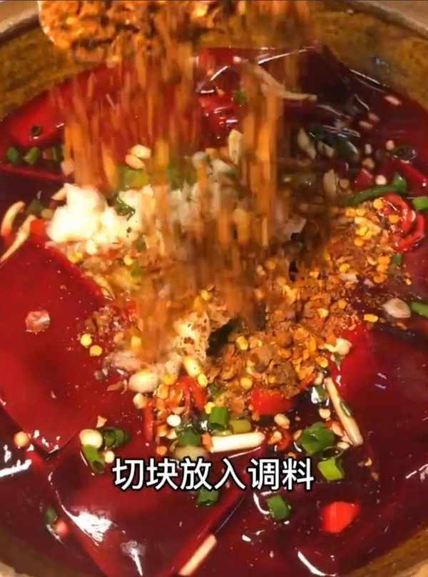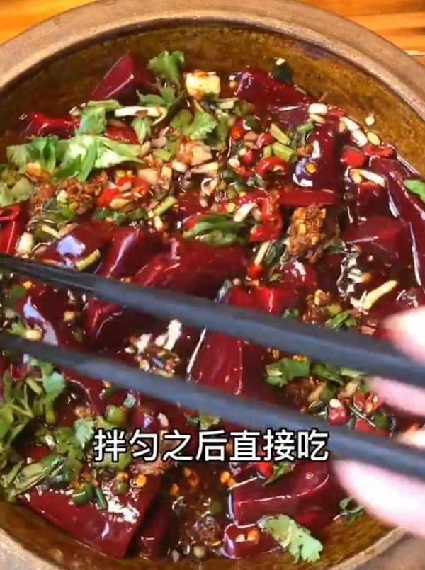 制作方法:將新鮮生豬血(一定要新鮮的)切塊,然後放入米醋,加入以上所有調料,攪拌均勻即可!