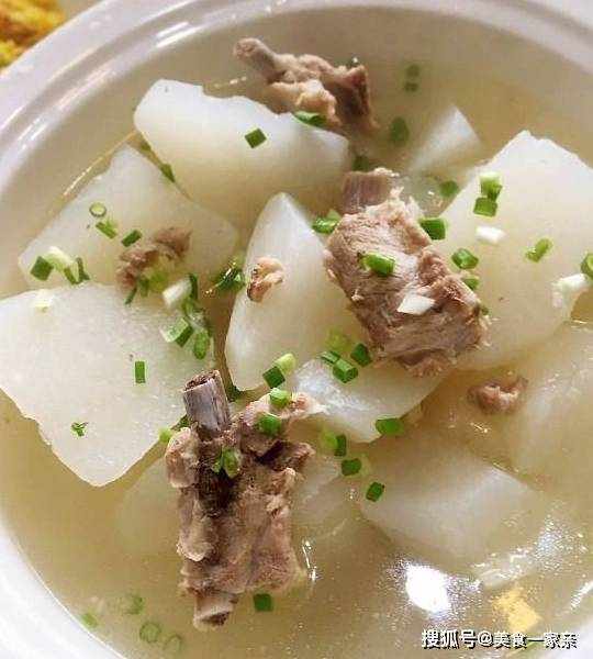 3、將排骨放進鍋中煮過血水撈出沖洗幹凈,接著將洗好的排骨和蘿卜一起放進鍋中,然後再加鹽、薑片和水慢燉40分鐘。
