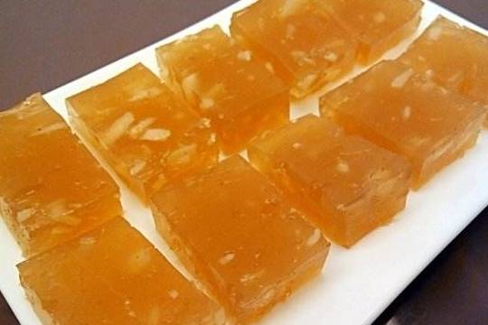 第1種馬蹄糕,馬蹄糕這種糕點也是廣東福建地區非常傳統的一種用荸薺和糖水制作出來的。顏色是屬於茶黃半透明的,吃起來甜蜜軟滑,老外吃瞭之後覺得這種小吃特別合胃口,入口即化,酸甜可口。你吃過嗎?