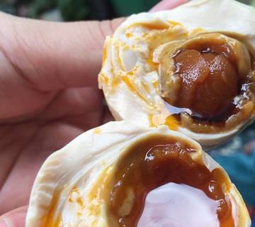 另外一種就是廣西北海的海鴨蛋,一個海鴨蛋再配上一碗白粥,這也是北海人常見的早飯,畢竟靠海吃海,就連這兒的鴨子都是吃海裡的小魚長大的。海鴨蛋不像陸地的鴨所下的,但它的味道有一股蟹黃般的鮮香味道,吃在嘴裡面又細又軟,醇香綿綿,沙沙的口感都會滲出一層鴨蛋油。