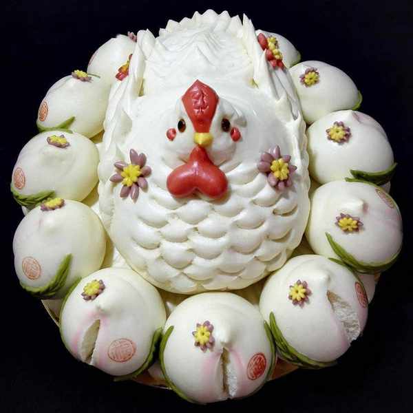 雞餑餑出鍋後,被整整齊齊擺在箅子上。小老虎活潑可愛,活靈活現的雞餑餑身上戴著綠油油的寶葫蘆,黃色的魚兒擺動優美的線條……黃白紅綠,色彩搭配得太好看瞭。母親蓋上白色的包袱,避免餑餑皮被風吹皺瞭。