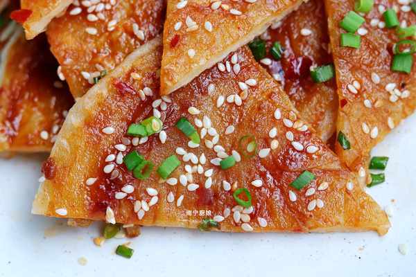 3.用手煎好煎餅後,將其放在一個大盤子上,用刷子蘸上之前準備好的醬汁。在煎餅的兩面刷上醬汁,撒上一點煮熟的白芝麻,再撒上蔥花,以增強香氣。