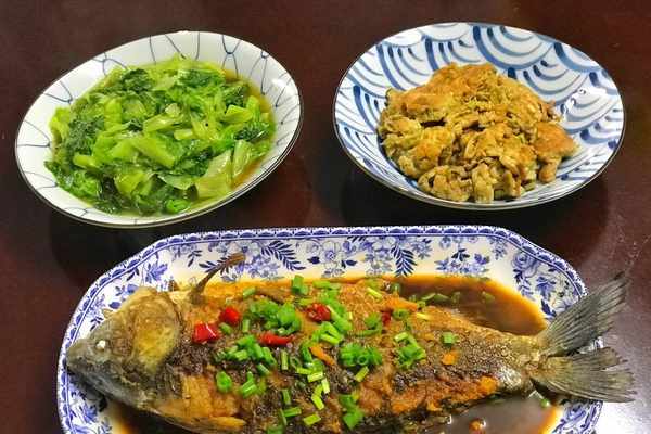 紅燒鯽魚:鯽魚是日常吃得比較多和一種魚,紅燒,煲湯都非常鮮美。鯽魚清洗幹凈後放油鍋中煎至兩面呈金黃色後加入料酒,生抽,老抽少許水煮至湯汁濃稠後加少許糖調味即可,出鍋前撒上香蔥。