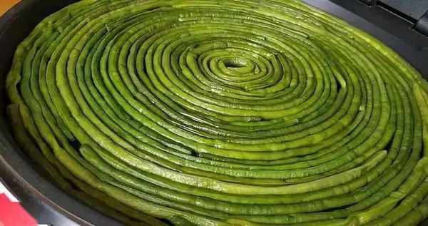 冷鍋,把過完水的豆角盤好在鍋中