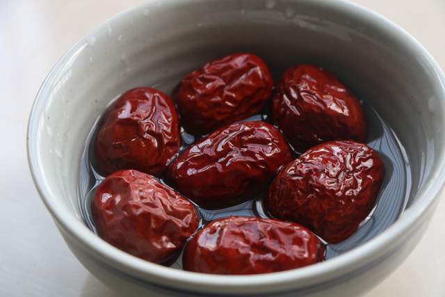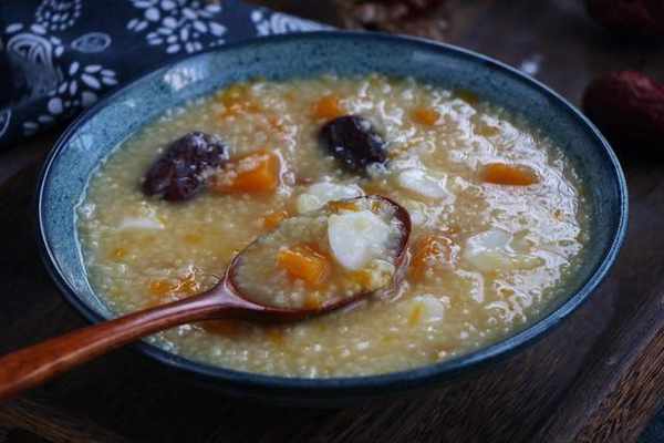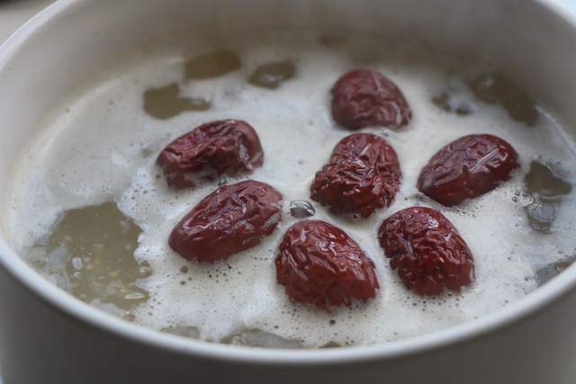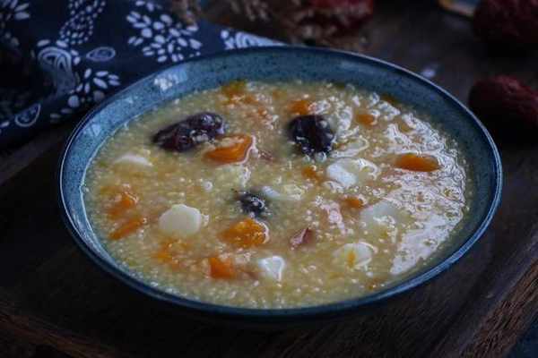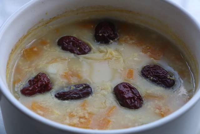 8、最後,將熟好的山藥小米粥盛入碗中,加入適量的紅棗作為點綴,即可食用。