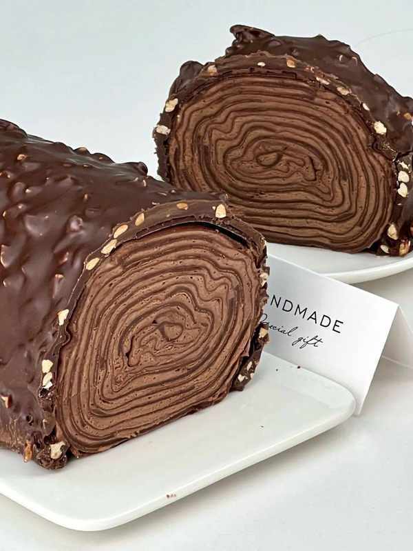 4、皮涼瞭以後依次鋪開,B淡奶油➕糖➕香草膏打發到酸奶狀態,加入冷藏的巧克力打發,在千層皮上抹平,卷起來冷藏2小時。
