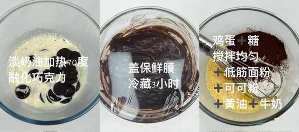 1、A淡奶油加熱融化黑巧克力,貼保鮮膜冷藏3小時。