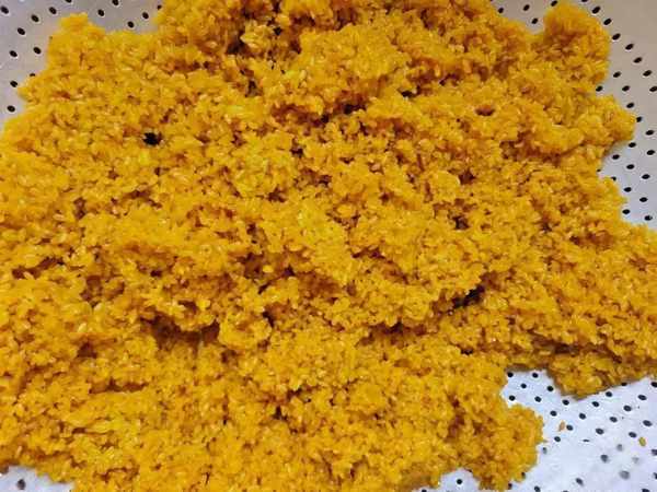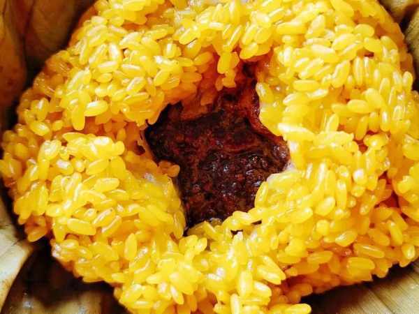 一直以來,染飯花粑粑都是竹箐村人民喜愛的美食。制作染飯花時,要先將曬幹的染飯花用100度的沸水煮5—10分鐘,做成金黃色的染飯花水,並過濾去渣,然後把白糯米淘洗幹凈,用熬好的染飯花水浸泡糯米一夜,泡好後,把水倒掉,金黃色的蘸米就泡好瞭。接下來就要開始和面,制作餡料。餡料主要用紅糖和蘇子做成,將紅糖切碎、蘇子炒香,攪拌做餡料。糯米面要壓成餅狀,把餡料放入其中,收口捏緊後輕輕搓成圓球,在最外層裹上黃色蘸米,在蒸籠裡撒上一層蘸米,也可以撒上一些青豌豆,可依個人口味而定。上汽之後將捏好的糯米圓球依次排開,撒上一層黃色蘸米,放進蒸籠裡面,蓋上鍋蓋,蒸兩個小時,染飯花粑粑就出爐瞭。