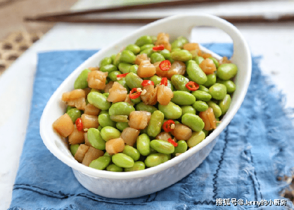 幹貝清洗一下,再加用冷水浸泡一會兒。毛豆去掉外殼,剝好後抓洗幹凈,去掉毛豆表面的白色薄膜。