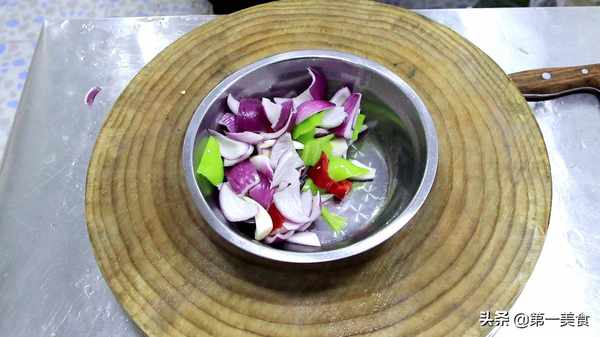 1.加工原料:將一個洋蔥切成小塊,將一片紅辣椒去籽切成塊,將一半青椒去籽切成菱形塊。徹底清潔所有成分。