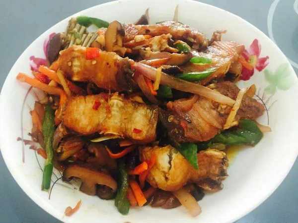 6 把炒好的泡椒 倒入煎好的魚塊中