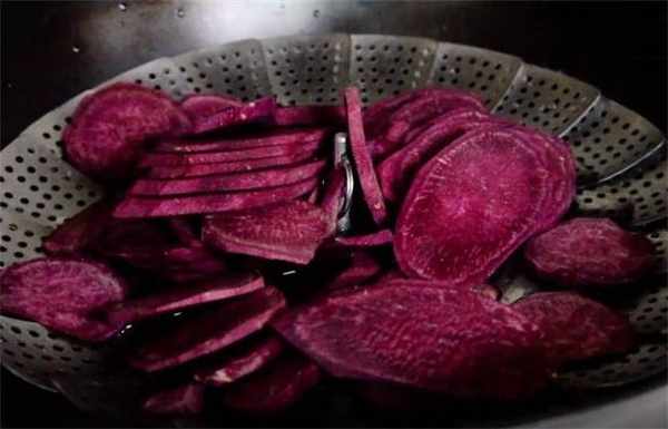 1.先把紫薯削皮切塊,咱們把紫薯蒸一下,大火燒開蒸15分鐘。
