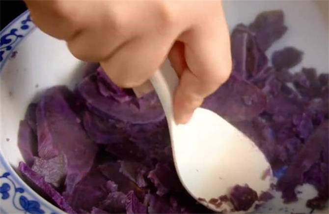2.紫薯蒸好瞭取出,用勺子壓成比較細膩的泥。