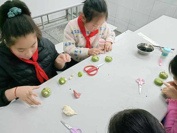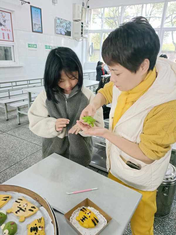 舌尖美食,指尖藝術。進入課堂中,周老師細致介紹瞭傳統花式面點的歷史文化,傳播其中蘊含的豐富寓意及創作的藝術美感。她將菠菜汁、南瓜泥等食材揉入面粉,並教授“口訣”,現場示范制作瞭青蛙、老虎、豬等卡通造型面點,讓孩子們驚嘆不已。
