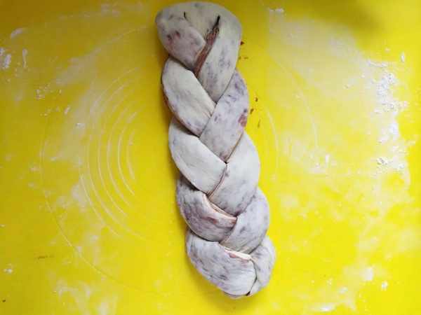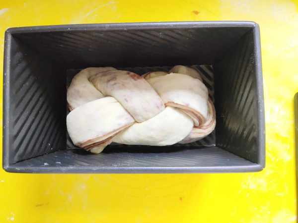 ? 編三股麻花辮,底部捏緊,兩頭向下對折,放入吐司盒裡,在溫度不超過35度環境下發酵,發酵到吐司盒八分滿,表面刷薄薄一層牛奶,烤箱預熱,烤箱180度35分鐘左右(每傢烤箱溫度不一樣,註意時間和溫度,表面上色後加蓋錫紙已免上色嚴重)