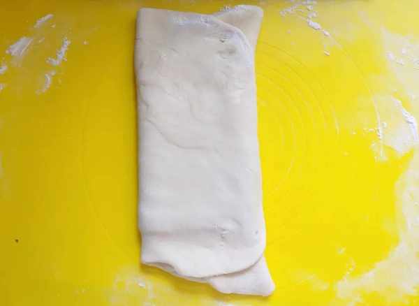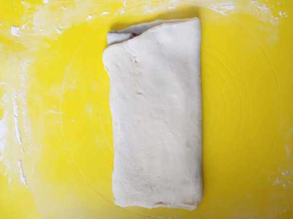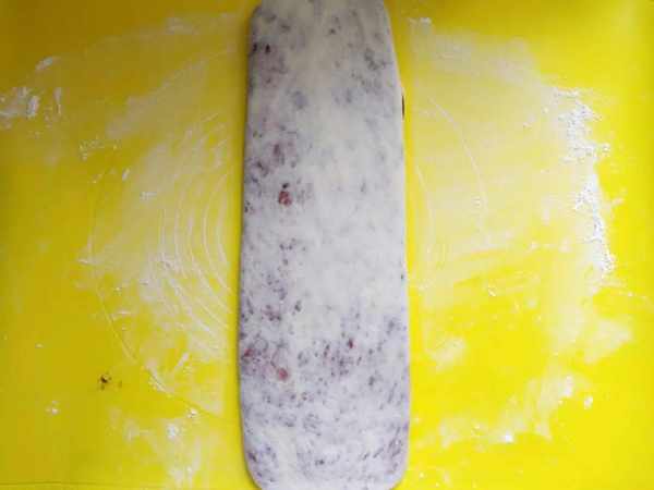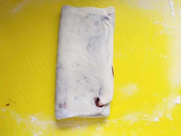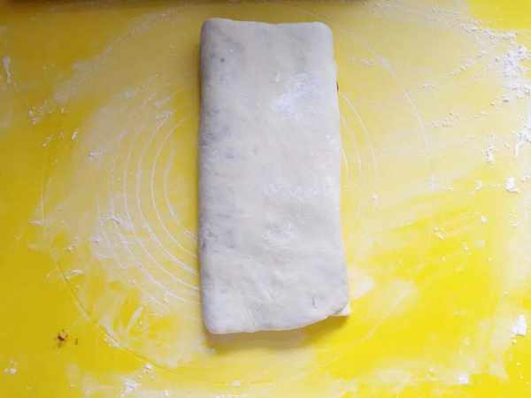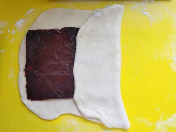 把沒有豆沙一邊的面團向中間折疊,再把有豆沙的一邊也向中間折,蓋到剛才的面團上;