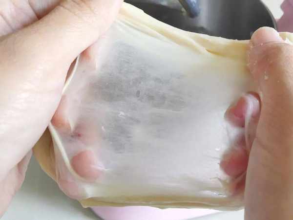 4、揉出粗膜後加入軟化好的黃油,啟動廚師機揉出手套膜(這裡需註意面團的溫度不能超過26度,如面團溫度上升可以把面團放入冰箱冷凍室冷凍20分鐘再揉,或者廚師機面缸綁冰袋降溫)