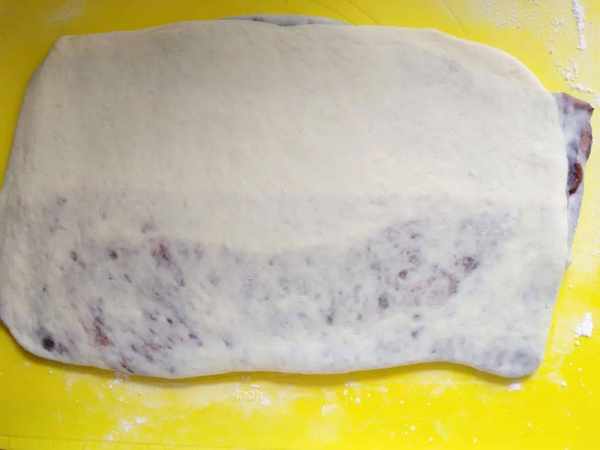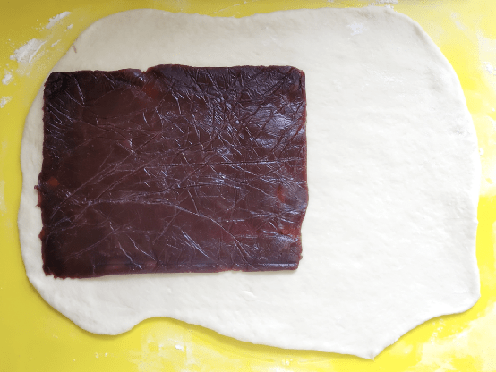 8、把面團搟成長方形,豆沙餡去掉保鮮膜放到面團上,大小如圖所示;