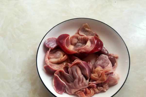 第一步:雞胗撕掉外面的油脂,從中間切開,撕掉雞內金和沒消化完的食物,用水沖洗幹凈,加鹽搓洗2遍,再次沖洗幹凈。