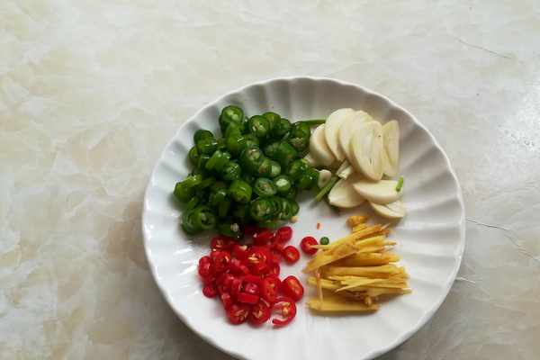 第五步:生薑去皮切絲,蒜米去皮切塊,線椒切小段,小米椒切小段。