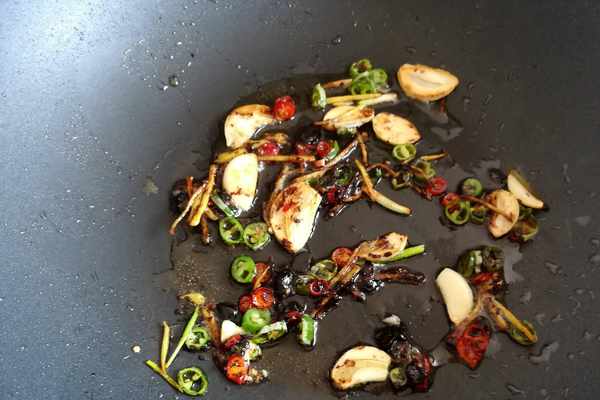 第六步:大火熱鍋放油,轉中小火放入薑絲、蒜片和一半辣椒翻炒出香味,加豆瓣醬翻炒一會。