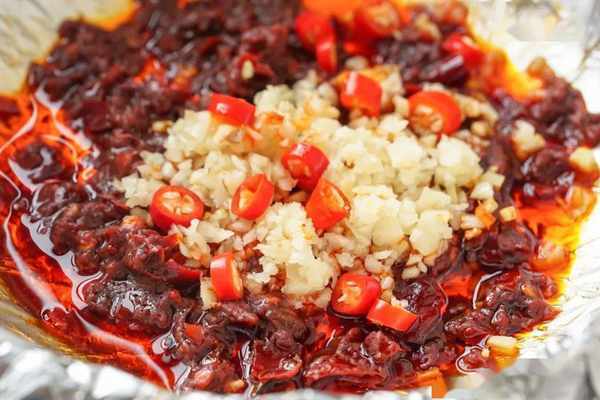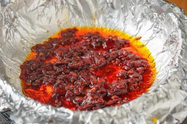 5. 倒油,讓錫紙碗裏底部鋪滿油,先用中小火把2勺郫縣豆瓣醬炒出紅油。